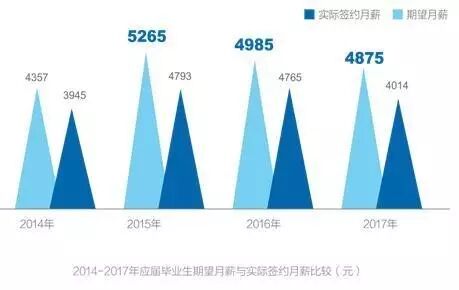 調(diào)查還顯示,縱觀2014年至2017年,應(yīng)屆畢業(yè)生的期望月薪及實(shí)際簽約月薪均有所下降。具體來看,相較2016年,2017年應(yīng)屆畢業(yè)生的期望月薪僅降低110元,而實(shí)際簽約月薪較去年降幅達(dá)到751元。此外,實(shí)際簽約月薪大于等于期望月薪的僅占24.2%,實(shí)際小于期望的占75.8%。