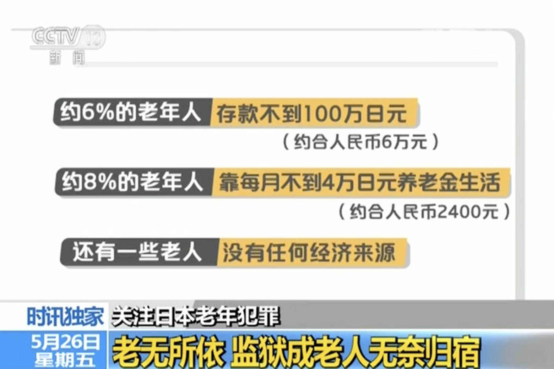 很多老年人走向犯罪是因?yàn)樨毨??!斗缸锇灼凤@示,約6%的老年人的存款不到100萬日元(約合人民幣6萬元),約8%的老年人只能靠每月不到4萬日元(約合人民幣2400元)的養(yǎng)老金生活。還有一些老人,甚至沒有任何經(jīng)濟(jì)來源。