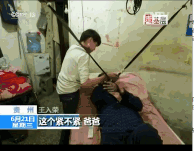 開始,突遭家庭變故的王入榮,完全不知該怎么來照顧癱瘓在床的爸爸。一些好心人上門為他們在天花板上安裝了一部滑輪,大伙告訴王入榮,長期癱瘓臥床的病人,最怕的是患上褥瘡,如果能經(jīng)常給爸爸翻翻身子、洗洗澡,就能防止得褥瘡。王入榮記住了好心人們的話,從此,他就借助這個器械為爸爸翻身子。