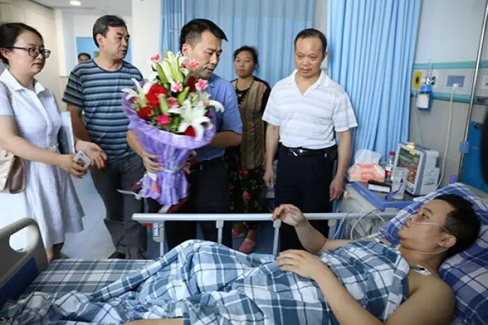 據(jù)了解,這幾日有許多熱心市民和各界人士來到醫(yī)院看望徐前凱,給他帶來水果鮮花,以及寫有祝福語的卡片。當(dāng)有人送上鮮花時,徐前凱努力直起身子,伸出雙手接花,嘴里重復(fù)著“感謝關(guān)心”、“這是我應(yīng)該做的”。