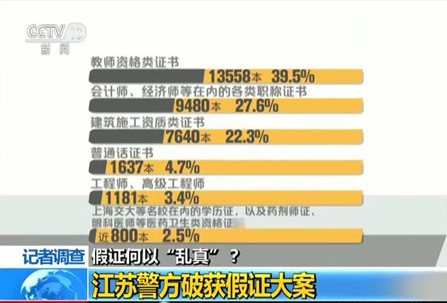 在本案涉嫌已經(jīng)辦出的34260本假證書中:教師資格類的證書13558本,占39.5%;包括會(huì)計(jì)師、經(jīng)濟(jì)師等在內(nèi)的各類職稱證書9480本,占27.6%;建筑施工資質(zhì)類的證書7640本,占22.3%;普通話證書1637本,占4.7%;工程師、高級工程師1181本,占3.4%;此外還有包含上海交大等名校在內(nèi)的學(xué)歷證,以及藥劑師證、眼科醫(yī)師等醫(yī)藥衛(wèi)生類資格證近800本,占2.5%。