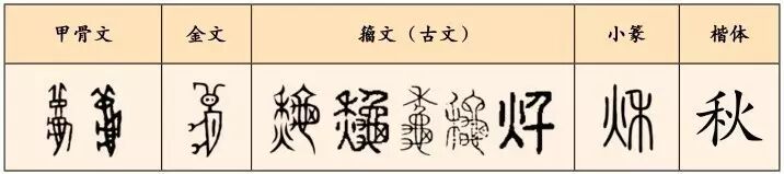 秋:甲骨文字形為蟋蟀形,蟋蟀又名秋蟲(chóng),蟲(chóng)以鳴秋,借以表達(dá)“秋天”的概念。籀[zhòu]文的“秋”在蟋蟀形左邊又添加“禾”旁,本義是收成,成熟的莊稼。籀文的另一種寫(xiě)法“秋”,右邊是蟋蟀形,左邊為禾下加火字,表示秋天禾谷熟,似火灼。