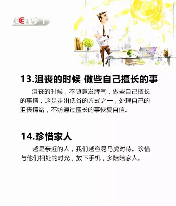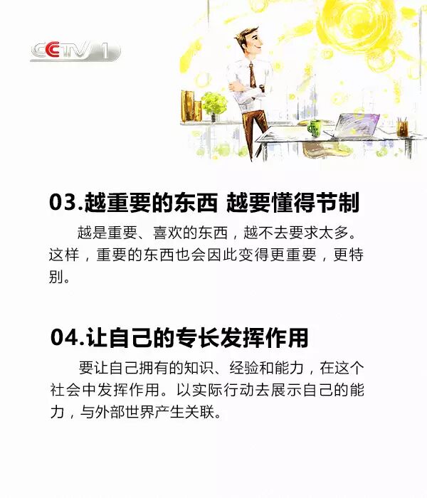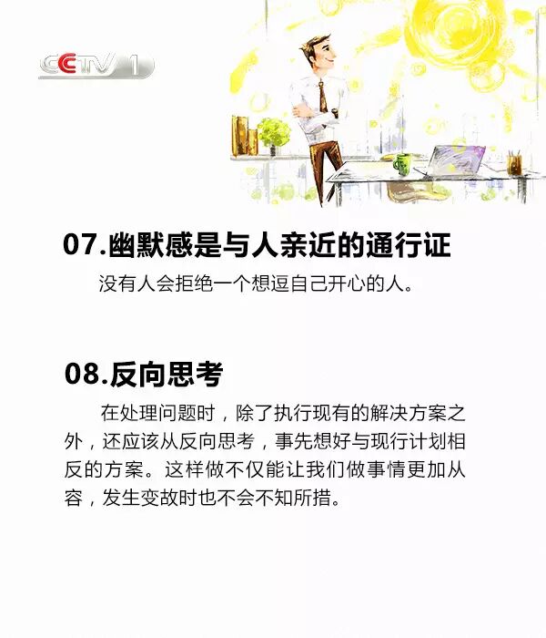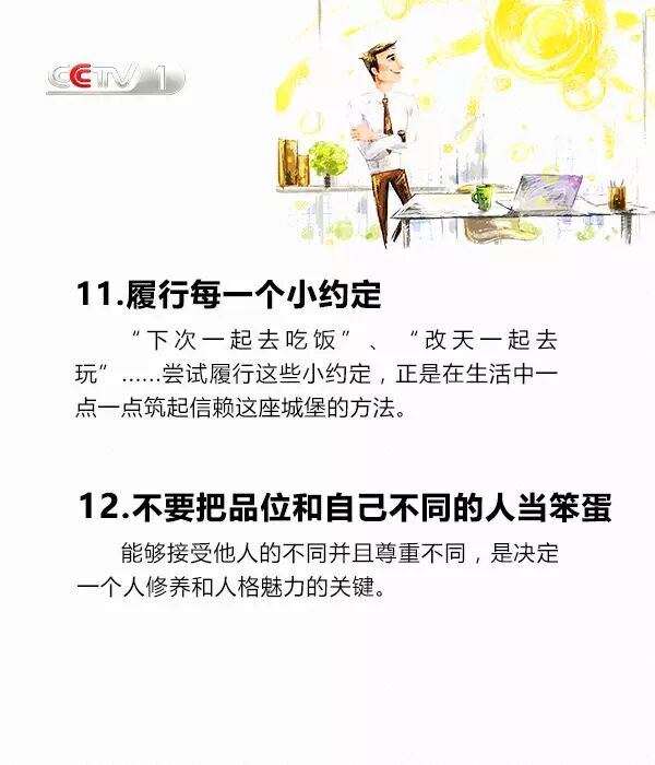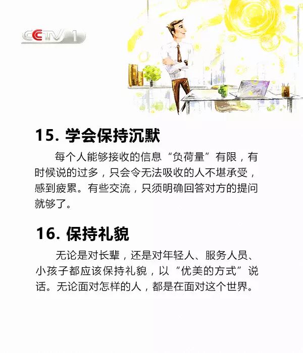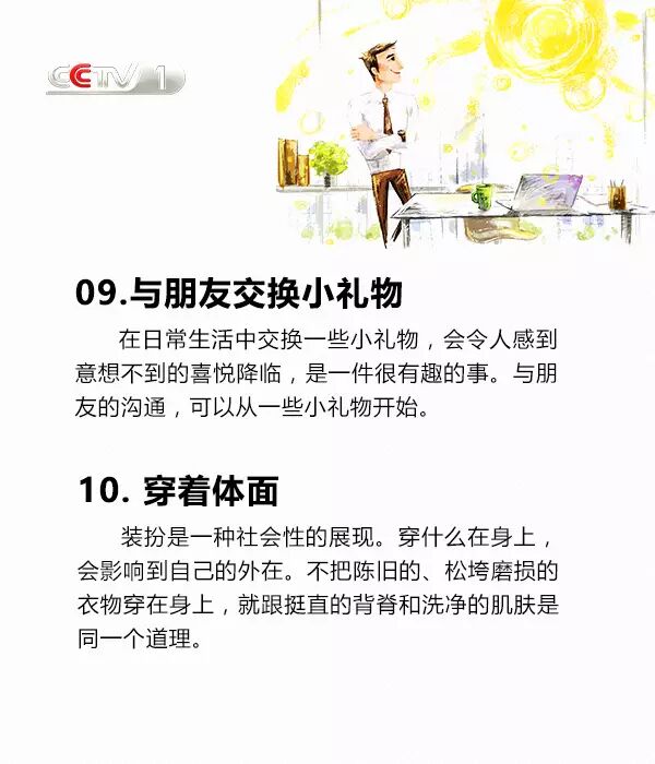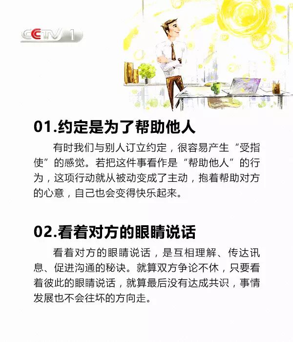 把約定看作是幫助他人,把被動(dòng)的完成變成主動(dòng)的接受;說話看著對(duì)方的眼睛,眼神交流也很必要;學(xué)著幽默,沒有人會(huì)拒絕想逗自己開心的人;穿著體面,裝扮是一種社會(huì)性的展現(xiàn);接受別人的不同,并尊重不同......