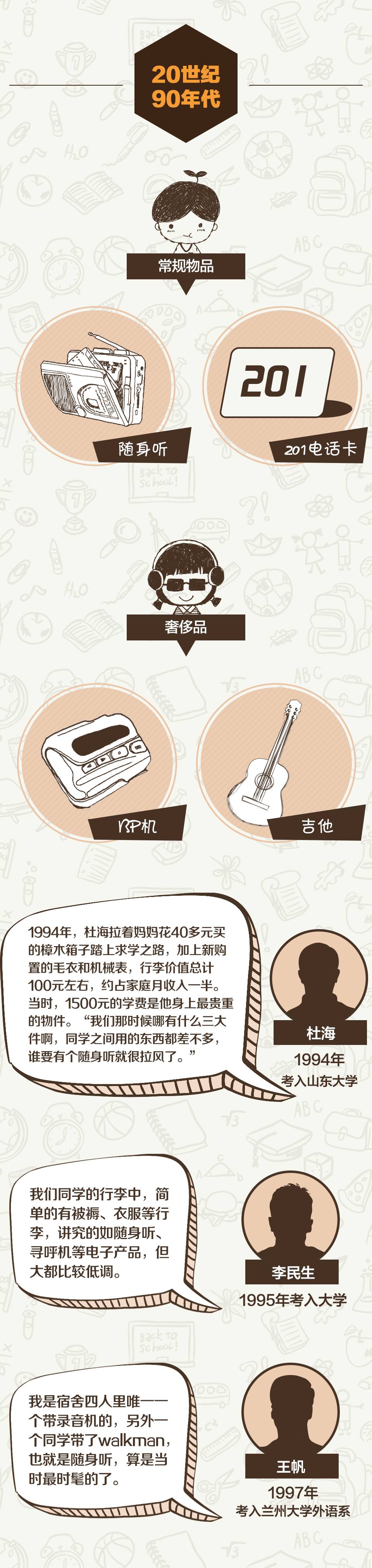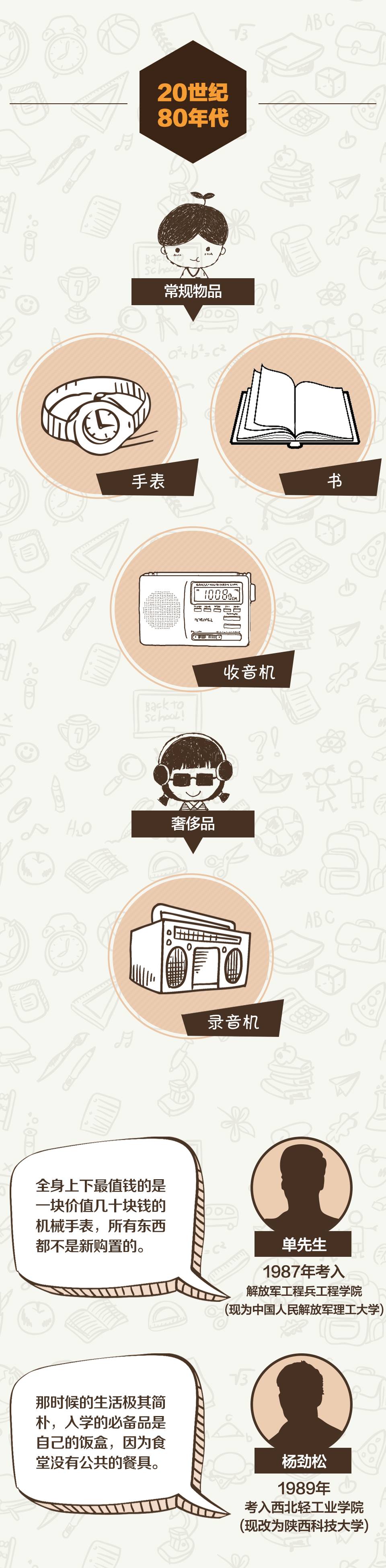 40年前,恢復(fù)高考后的第一批大學(xué)生入學(xué)時(shí),學(xué)生們背著水壺、臉盆、被褥,帶著咸菜、干糧去學(xué)校報(bào)到。如今,手機(jī)、筆記本電腦、iPad“三件套”等電子產(chǎn)品才是大學(xué)新生的“標(biāo)配”。