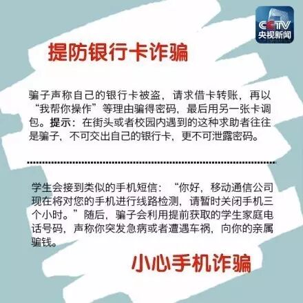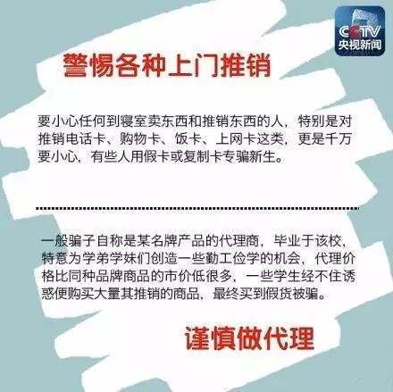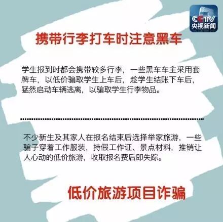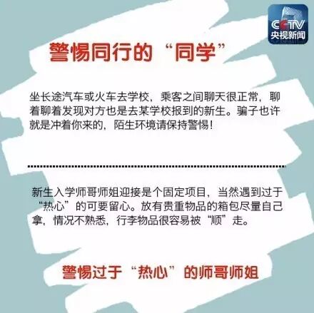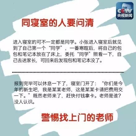 每年新生報道時,人員流動較大,是詐騙案件的高發(fā)時期。冒充新生接待員,拎走行李一去不回;幫忙代繳學(xué)費,拿走錢后不知去向;冒充老師和學(xué)生干部,進(jìn)入新生寢室收取各種費用……如何甄別詐騙伎倆,平安開始新生活?擦亮雙眼,提高警惕↓↓↓