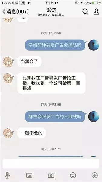 另外,多個高校新生群中,還出現(xiàn)不少以學(xué)長、學(xué)姐名義,發(fā)廣告高薪招聘刷單員、各類兼職的QQ群。一名操作多個新生群的群主說,這些原本就是廣告群,為了吸引更多人,就把群名改成“新生群”。新生以為是學(xué)校的群,信任度就回增加。發(fā)廣告后,一旦有新生做了兼職,他們就可以拿提成。