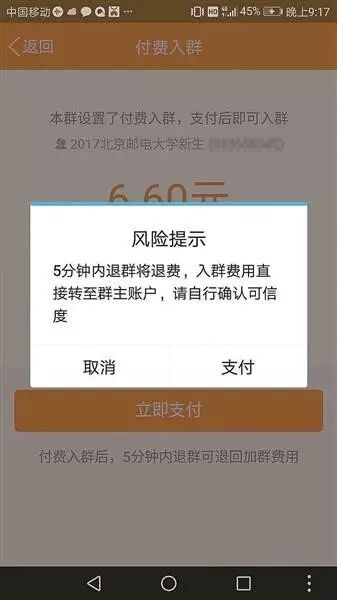 據(jù)了解,打著高校“新生群”名義,進(jìn)行收費、騙取新生錢財?shù)腝Q群不在少數(shù)。北京郵電大學(xué)(宏福校區(qū))的“準(zhǔn)大學(xué)生”王立(化名)稱,他所在的“2017北京郵電大學(xué)新生”QQ群,近日被改成了收費群,對入群新生收費6.6元。管理員自稱收費“是為了防止無關(guān)人員進(jìn)群”。此前,群主還曾承認(rèn),把該群賣給了一個賣卡的,“算打廣告,我賣的廣告位”,但這些錢款的去處,群主并未交待。