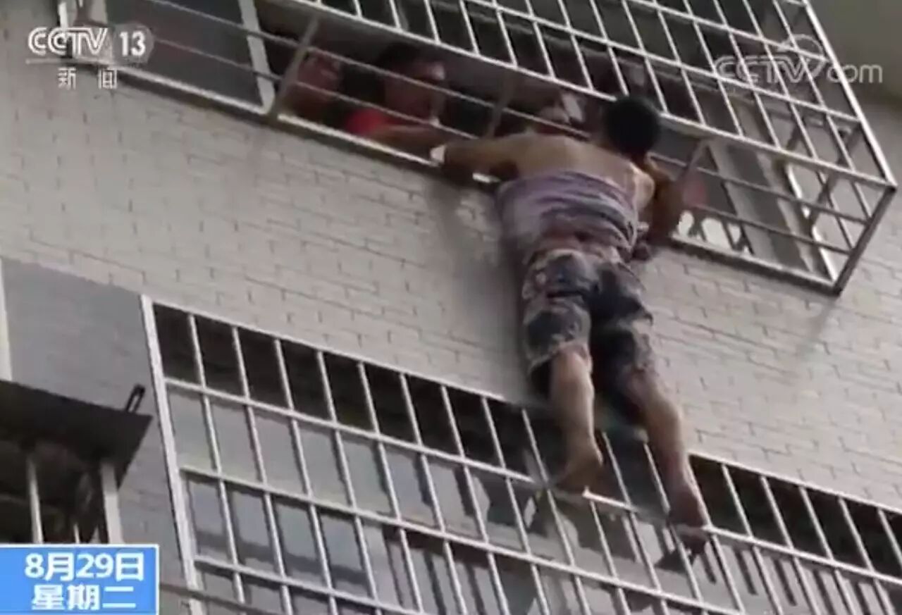 危急時刻,一名男子徒手爬了上去,赤著雙腳,踩在三樓窗戶的防盜欄上,托舉著小女孩。