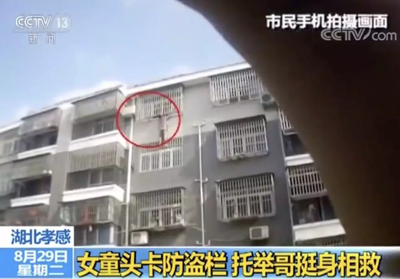 8月27日上午,在湖北孝感黃陂西路某小區(qū),一名獨(dú)自在家的3歲小女孩,爬到窗口玩耍,結(jié)果不慎從4樓窗戶外的防盜欄墜下,僅頭部卡在縫隙里,身體懸空,非常危險(xiǎn)。