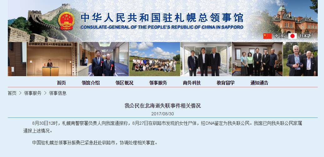 據(jù)中國(guó)駐札幌總領(lǐng)館消息,8月30日12時(shí),日本警方向領(lǐng)館通報(bào)了我公民在北海道失聯(lián)事件相關(guān)情況。日本札幌南警察署負(fù)責(zé)人稱,8月27日在釧路市發(fā)現(xiàn)的女性尸體經(jīng)DNA鑒定后,確定為我失聯(lián)公民。領(lǐng)館已向我失聯(lián)公民家屬通報(bào)上述情況。中國(guó)駐札幌總領(lǐng)事孫振勇已緊急趕赴釧路市,協(xié)調(diào)處理相關(guān)事宜。