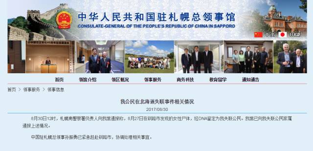 8月30日,札幌南警察署負(fù)責(zé)人通報(bào)稱,8月27日在釧路市發(fā)現(xiàn)的女性尸體,經(jīng)DNA鑒定為中國(guó)福建失聯(lián)女教師危秋潔。