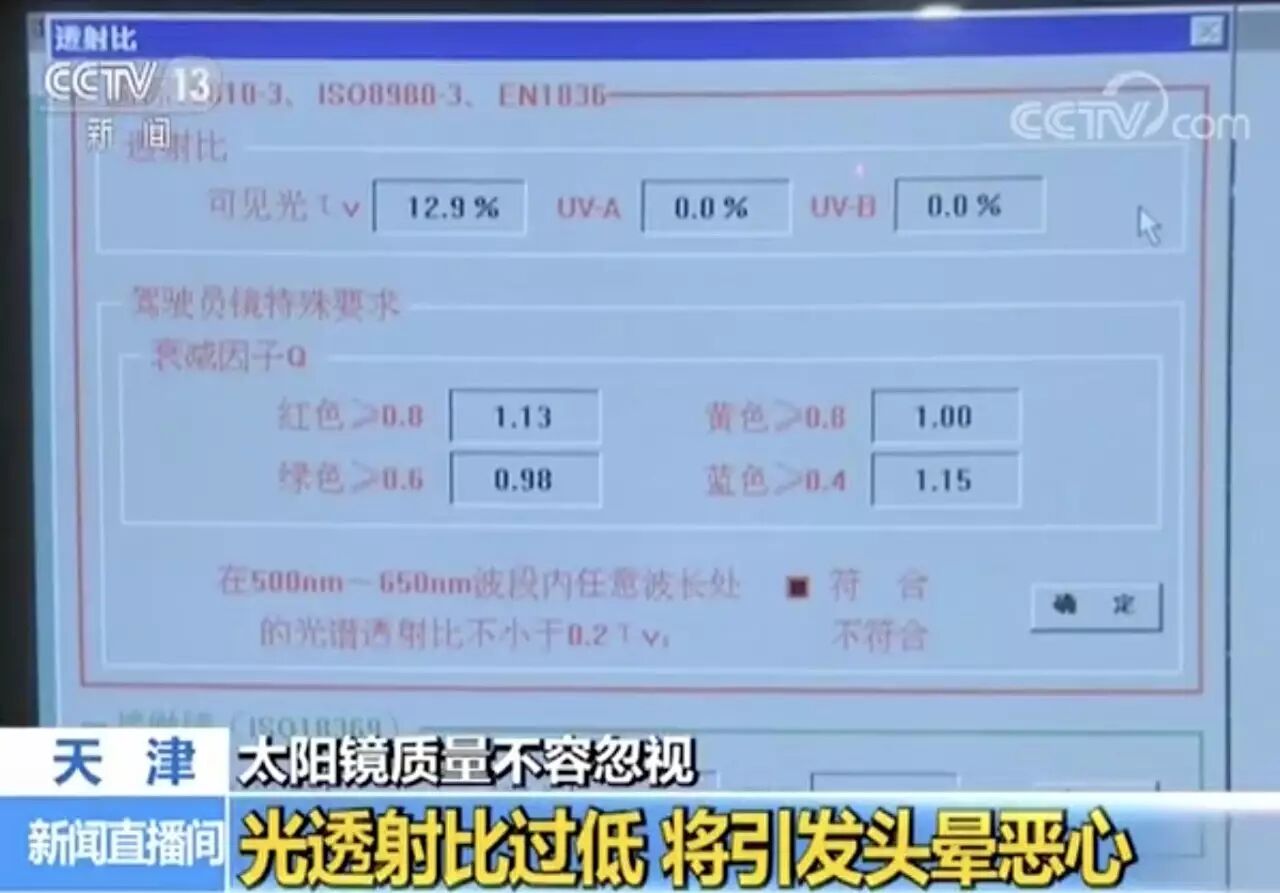 如遮陽(yáng)鏡三類(lèi)產(chǎn)品,光透射比應(yīng)該在8%到18%之間,但是經(jīng)過(guò)檢測(cè),一款標(biāo)稱(chēng)為“流星情緣”的太陽(yáng)鏡實(shí)測(cè)值只有4.3%~15.0%,不符合標(biāo)準(zhǔn)要求。檢測(cè)人員告訴記者,日常環(huán)境中如果長(zhǎng)時(shí)間佩戴這種光透射比過(guò)低的太陽(yáng)鏡會(huì)引發(fā)視覺(jué)疲勞,嚴(yán)重者可出現(xiàn)頭暈、惡心等不適癥狀。