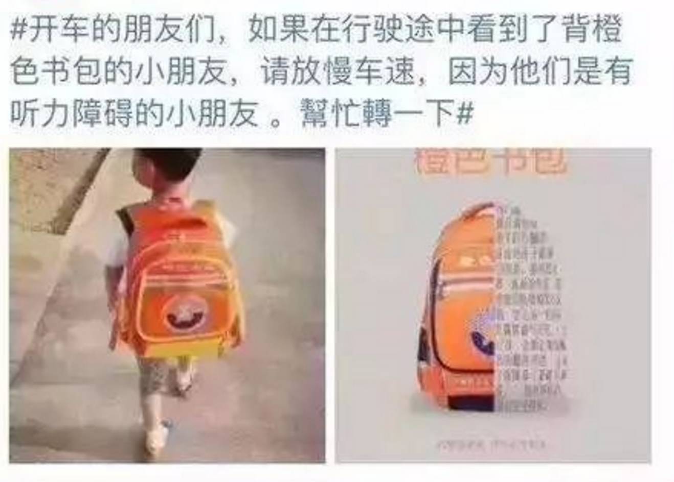 最近,一條“開車看到背這種橙色書包的孩子,請(qǐng)務(wù)必放慢車速.......”的微博在朋友圈傳播,許多網(wǎng)友為這種正能量點(diǎn)贊,紛紛轉(zhuǎn)發(fā)擴(kuò)散。不過,也有人質(zhì)疑:“這圖這么糊,別是朋友圈隨便轉(zhuǎn)發(fā)的謠言吧?”據(jù)了解,“橙色書包”是真的!