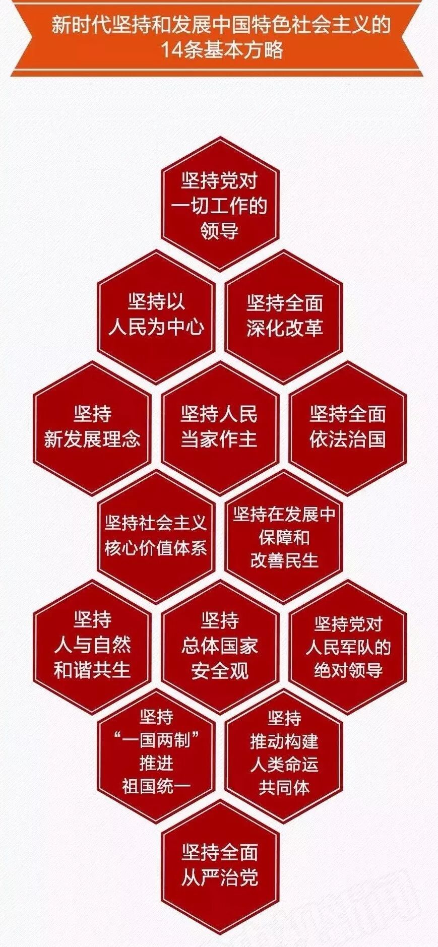習(xí)近平新時代中國特色社會主義思想這次概括的不僅是理論體系,而且提出了基本方略,這個是很大的理論創(chuàng)新,十四個方面涵蓋了堅持和發(fā)展中國特色社會主義的主要內(nèi)容。基本理論、基本路線、基本方略合為一體,這在以前的理論發(fā)展中是少見的,甚至可以說是這一次最大的一個理論亮點。