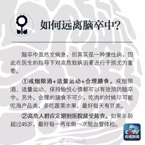 如果發(fā)生一些腦中風(fēng)的預(yù)警信號(hào),如一過性頭暈,一過性肢體麻木無力,一過性口眼歪斜,流口水;一過性言語不利等,應(yīng)該及時(shí)到醫(yī)院就診。