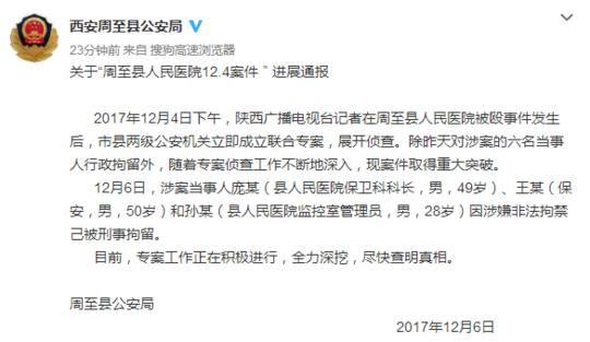 打人事件發(fā)生后,周至縣委縣政府介入調(diào)查,于12月5日公布了事件處理進展: 周至縣公安局依法行政拘留涉事6人;周至縣人民醫(yī)院涉事院長停職接受調(diào)查;對涉事的周至縣人民醫(yī)院相關(guān)副院長、保衛(wèi)科科長予以撤職。
