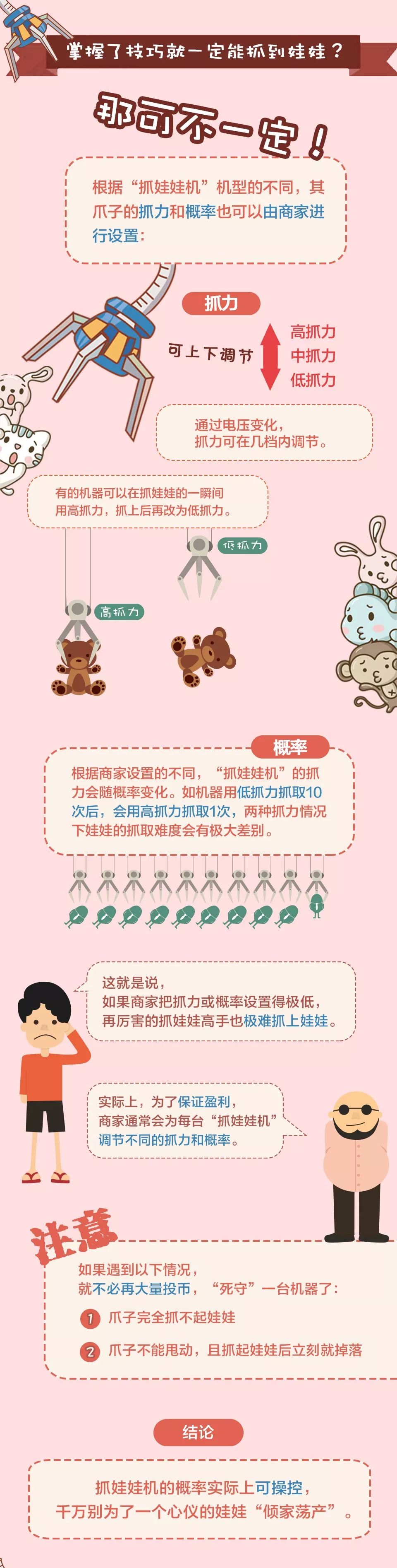 這起事件進(jìn)一步證實“抓娃娃機(jī)”的概率是可以進(jìn)行調(diào)節(jié)的。那么,我們平時在玩“抓娃娃機(jī)”時,出現(xiàn)什么情況便意味著機(jī)器概率“有問題”,不宜再玩?對于“抓娃娃機(jī)”,技巧又是否有用?一起來看下面的解讀,讓你玩“抓娃娃機(jī)”不再虧↓↓↓