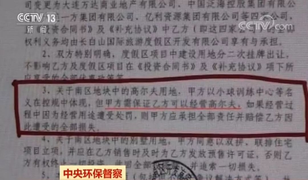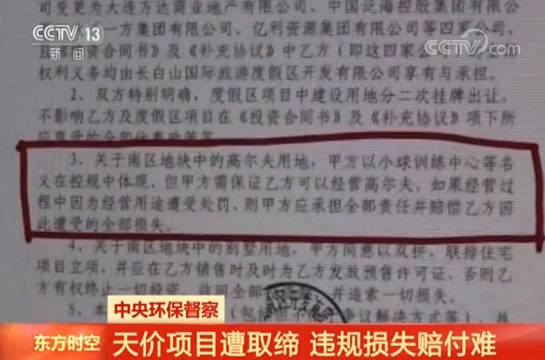 長白山國際旅游度假區(qū)的報告顯示,高爾夫球場項(xiàng)目的拆除,損失達(dá)上百億,而在當(dāng)年政府與企業(yè)方所簽訂的保障協(xié)議上,企業(yè)方曾經(jīng)提出“如果經(jīng)營過程中因?yàn)榻?jīng)營用途遭受處罰”,則甲方也就是政府“應(yīng)承擔(dān)全部責(zé)任并賠償全部損失”。