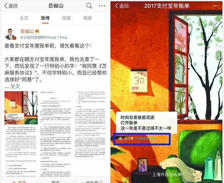 就在支付寶被工信部約談的前一天,支付寶已經(jīng)被網(wǎng)信辦約談。1月3日,在支付寶推出2017年度支付寶賬單的當(dāng)晚,一篇名為《緊急!查看支付寶年度賬單前,請(qǐng)先看看這個(gè)》的微博廣泛傳播,并引發(fā)了公眾對(duì)獲取個(gè)人信息的關(guān)注。1月4日凌晨,支付寶旗下的螞蟻金服發(fā)布聲明,反思此次行為。同時(shí),對(duì)于“默認(rèn)勾選”,也做出了及時(shí)調(diào)整。