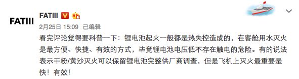 事情發(fā)生后,網(wǎng)友們紛紛評(píng)論,有一些網(wǎng)友看了視頻后,吐槽空姐用礦泉水滅火“不專業(yè)”,并稱“應(yīng)該用干粉滅火器給鋰電池滅火”。而后,有知名航空博主發(fā)博澄清:這就是正確操作!