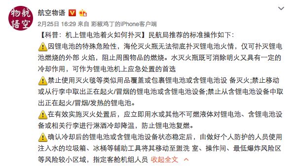 通過(guò)查詢民航局文件《鋰電池機(jī)上應(yīng)急處置指南》可以發(fā)現(xiàn),上文描述無(wú)誤。從視頻也可以看到,當(dāng)時(shí)工作人員高喊“旅客往后站”,并沖上前用礦泉水、飲料滅火,一位旅客在旁邊協(xié)助。中國(guó)南方航空也在微博上作出回應(yīng),表示空姐的處理及時(shí)、準(zhǔn)確。