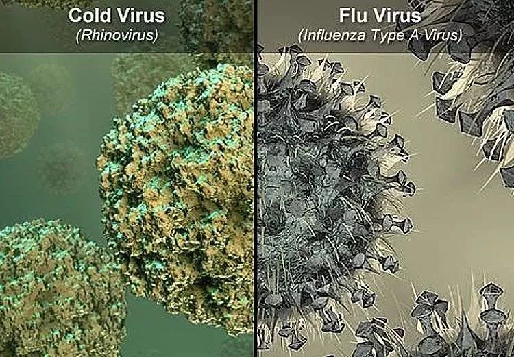 △引起普通感冒的是鼻病毒(左),引起流感的是流感病毒(右)