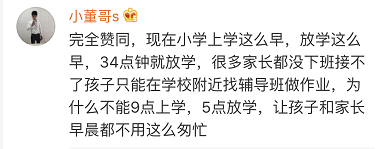 對于在家門口就近入學、爺爺奶奶接送、或者可能乘坐校車的孩子和家庭來說,可能會感受到新政策帶來的好處。但對于許多要親自接送孩子的上班族來說,反而可能帶來麻煩。 比如,以前7:30到校(8:00上課),把孩子送到學校后,自己去上班正好?,F(xiàn)在推遲到8:00到校,也推遲出門,自己上班就遲了;如果按原先的時間出門,孩子提前到了校門口,不僅起不到政策想起到的作用,還可能帶來安全問題……