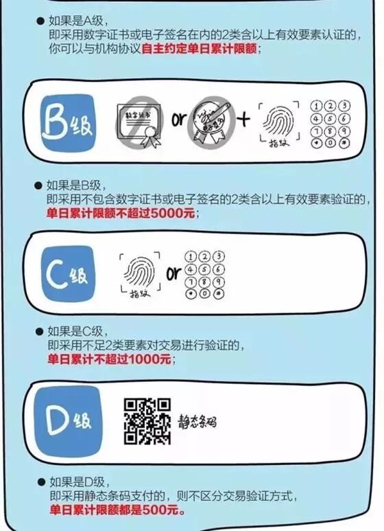對于使用動(dòng)態(tài)條碼(如手機(jī)上實(shí)時(shí)生成的條碼)進(jìn)行支付的,風(fēng)險(xiǎn)防范能力根據(jù)交易驗(yàn)證方式不同分為A、B、C三級,同一客戶單日累計(jì)交易限額分別為自主約定、5000元、1000元。