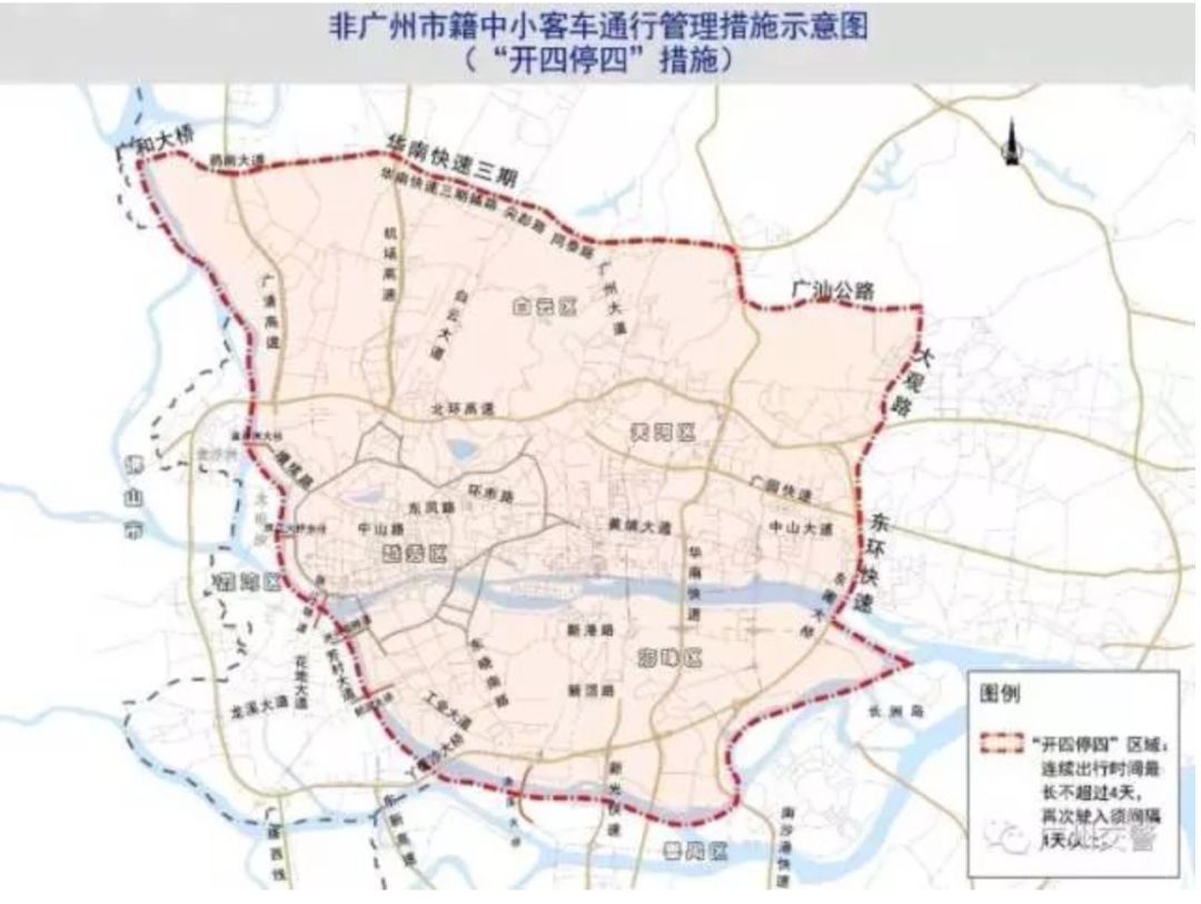 所謂開四停四,就是非廣州市籍中小客車駛?cè)霃V州市中心區(qū)連續(xù)行駛時間最長不得超過4天(自然日),再次駛?cè)腠氶g隔4天(自然日)以上。實施這一管控措施的區(qū)域面積,占廣州全市區(qū)域面積的3.5%,包括了越秀區(qū)、天河區(qū)的全部,和荔灣區(qū)、白云區(qū)大部分。