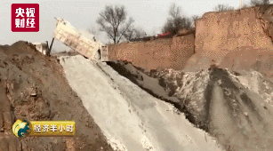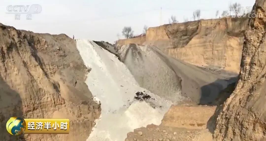 伴隨著發(fā)動機的轟鳴聲,卡車的后斗被抬起,一整車白色工業(yè)廢渣被傾倒在一個巨大的深坑里,灰色和白色兩種工業(yè)廢渣沿著卡車停過的位置滾落至坑底,從遠處看,好似兩種不同顏色的“瀑布”。