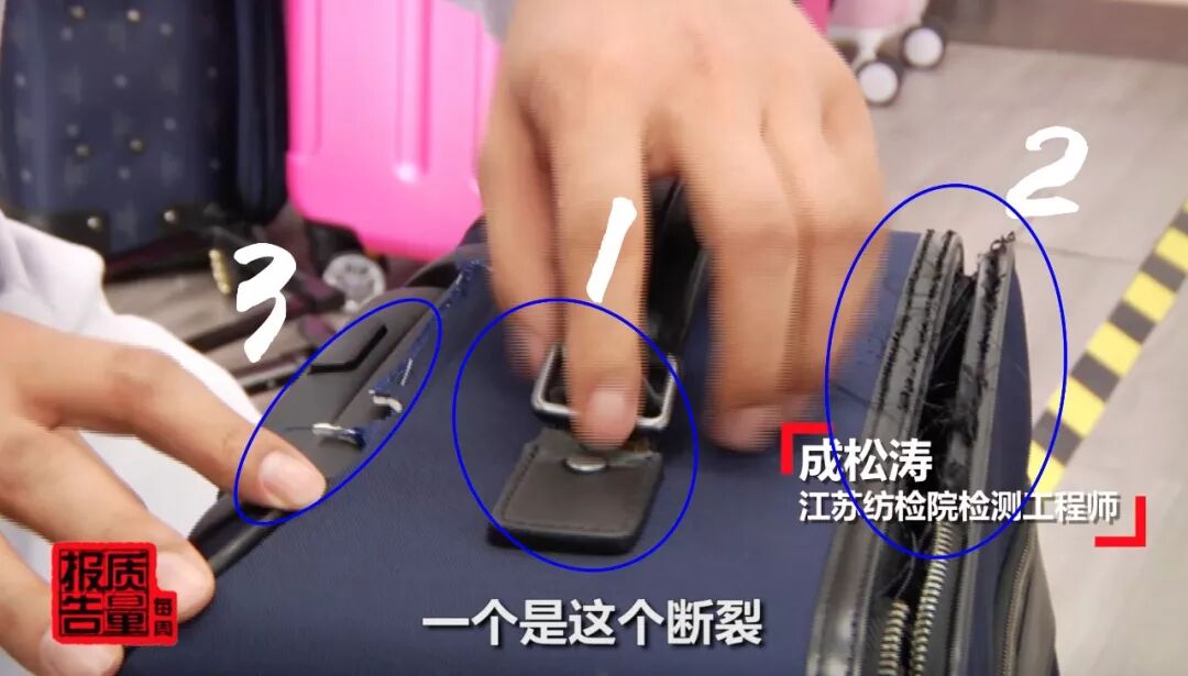 這款市面售價2980元的箱包,做一項監(jiān)測就出現(xiàn)了兩種情況,一個是把手?jǐn)嗔眩硗庖粋€是箱體開裂,并不是價格高一定質(zhì)量好。