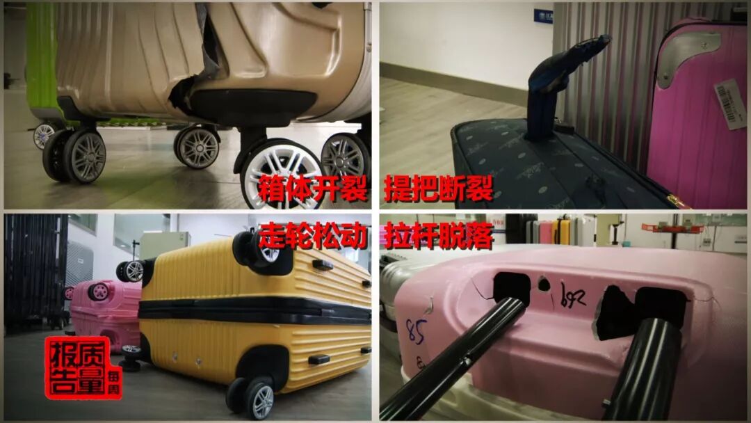 提把、拉桿結(jié)不結(jié)實,直接影響箱包正常使用。但是問題最多的恰恰就是這兩個部位的檢測。71批次不合格,53批次就出在了提把和拉桿的牢固度上,這些提把,都在檢測中斷裂。其它問題比如箱體變形破損、走輪連接松動,也出現(xiàn)一定比例的不合格批次。