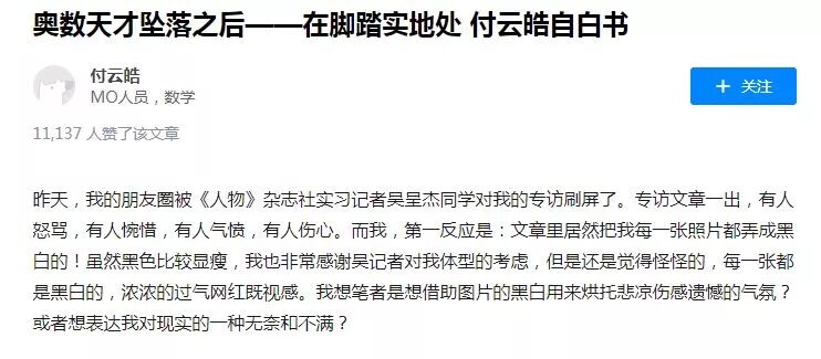 在這篇報(bào)道之后,故事的主人公付云皓很快寫了一篇長文反駁——《奧數(shù)天才墜落之后——在腳踏實(shí)地處 付云皓自白書》,用略帶自嘲的語氣,講述“墜落者”本人對于墜落的理解。
