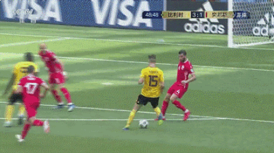 上半場補時第3分鐘,比利時再次拉開差距,德布勞內(nèi)傳球,穆尼耶橫切后直傳,反越位成功的盧卡庫小禁區(qū)前推射入網(wǎng),3-1。