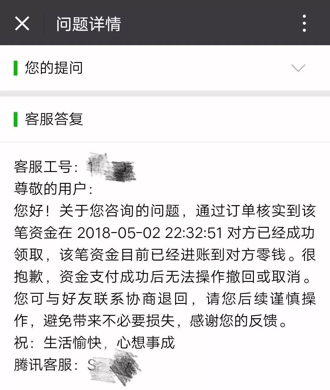 私下解決不了,黃先生首先嘗試向騰訊客服求助。一次次通過電話語音、留言與客服溝通,然而多次回復(fù)內(nèi)容都是:該筆資金已經(jīng)成功進入對方零錢,資金支付成功后無法撤回,您可與好友聯(lián)系協(xié)商退回。
