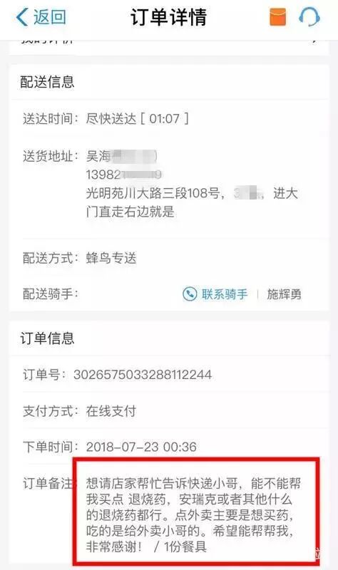 小吳想在網上買藥,發(fā)現(xiàn)很多藥店無法配送,就想到了外賣。7月23日00:36,小吳通過外賣下單并在備注欄留言: