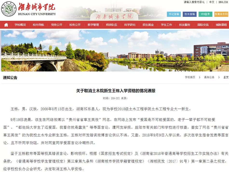 近日,湖南城市學(xué)院一學(xué)生在網(wǎng)上發(fā)布辱國言論,遭網(wǎng)友舉報(bào)。9月22日,校方在官網(wǎng)首頁“通知公告”欄目發(fā)布情況通報(bào),對(duì)土木工程學(xué)院土木工程專業(yè)大一新生王棟(網(wǎng)名為“貴州省省草王英俊”)發(fā)表辱國言論一事進(jìn)行處理:取消王棟入學(xué)資格。